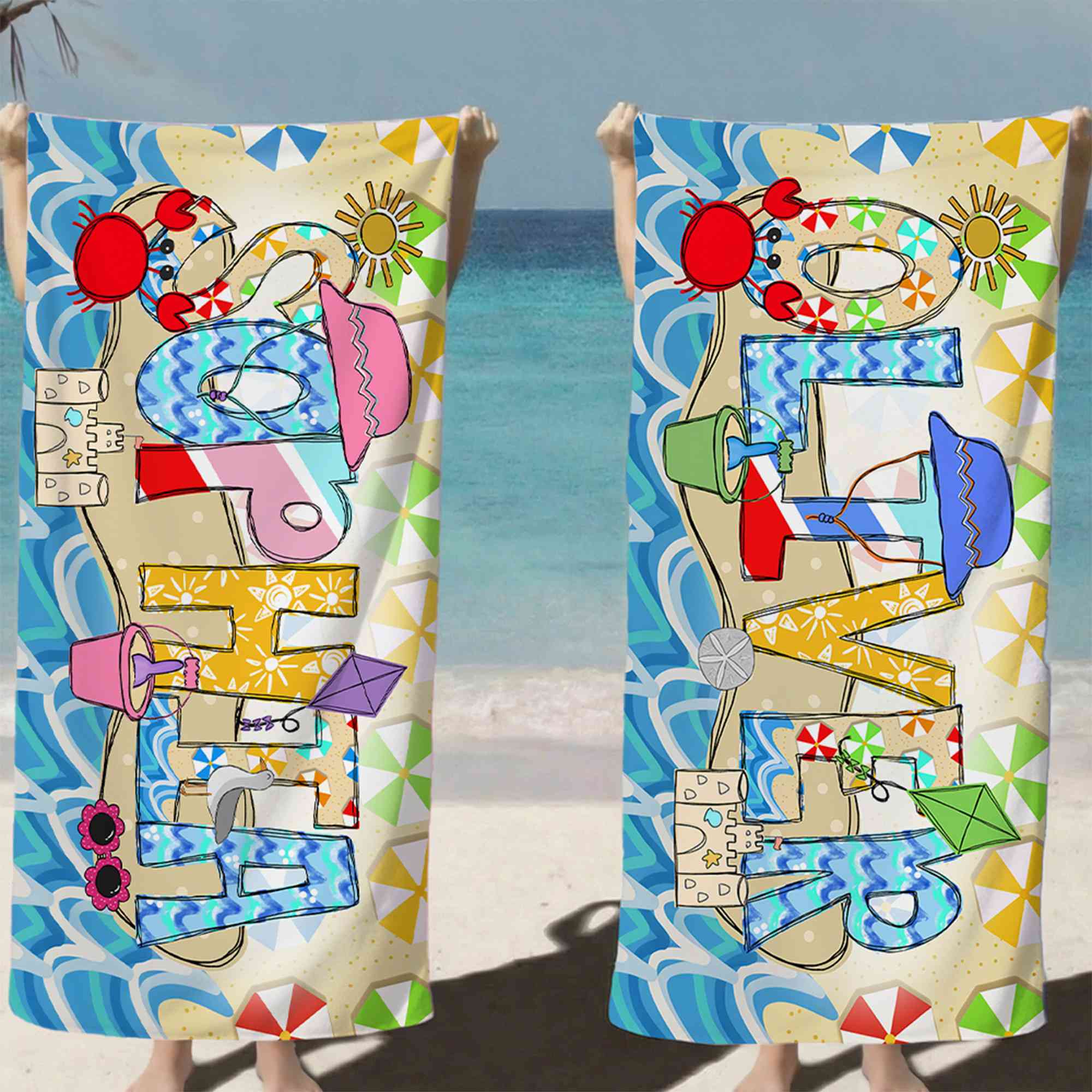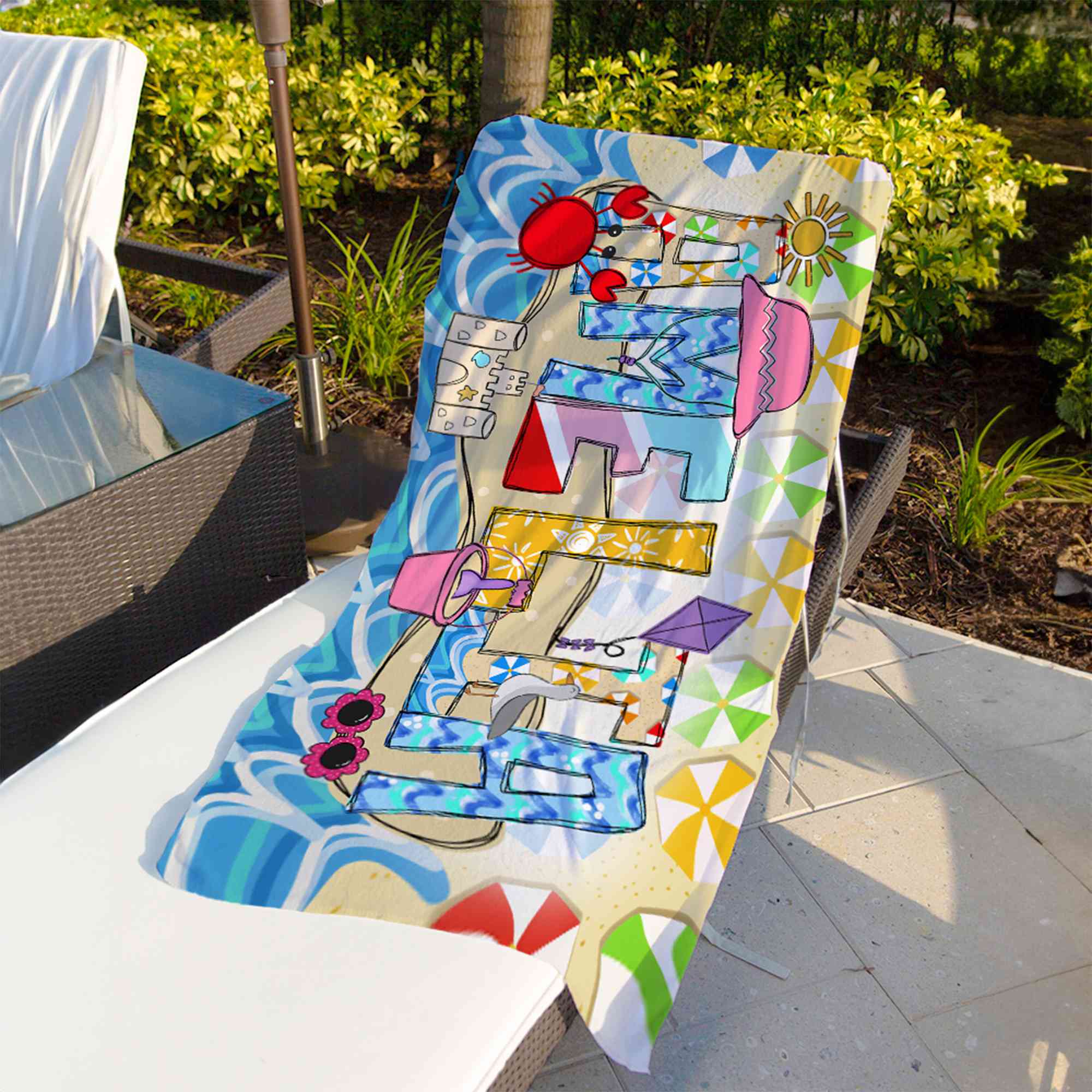 Summer Doodle Alphabet Design - This beach towel features a playful doodle-style alphabet paired with your chosen name, bringing bright summer vibes to every beach day. The bold letters and cheerful colors stand out beautifully on the sand or by the swimming pool, creating a fun and lively look that kids love.
